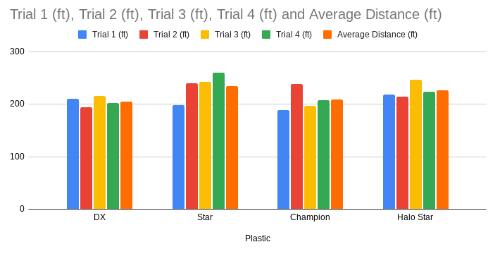 The results are striking. The Star plastic demonstrably outperformed the other plastics in terms of average distance. It outflew the DX by nearly 30 feet, the Champion by over 26 feet, and even the Halo Star by a noticeable 9 feet. This suggests that the Star plastic’s composition and molding process contribute significantly to enhanced glide and potentially reduced drag during flight. The Halo Star also achieved a respectable distance, placing second overall. The DX and Champion plastics, while not reaching the same distances, still offer unique flight characteristics that we’ll explore.